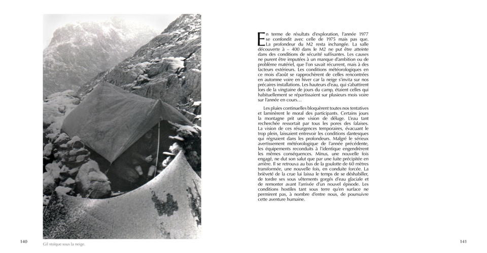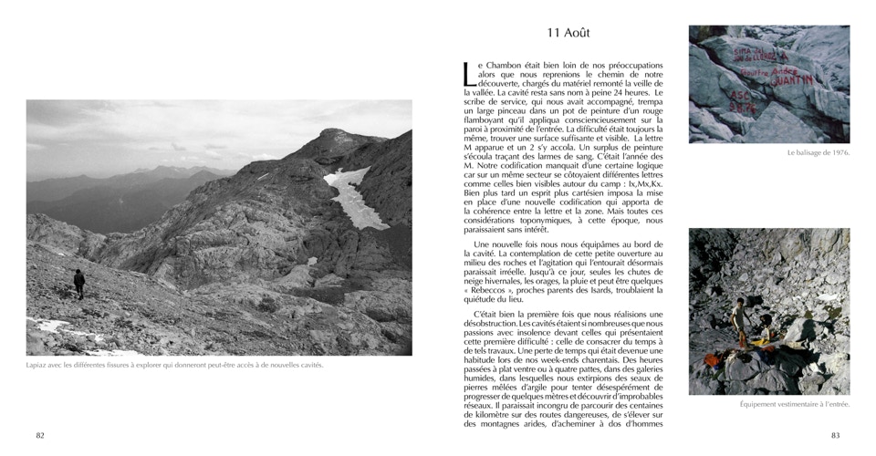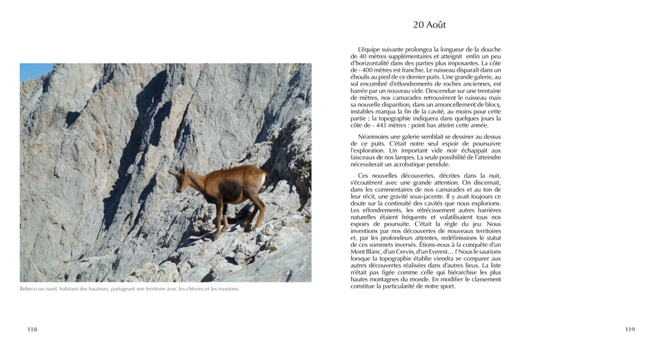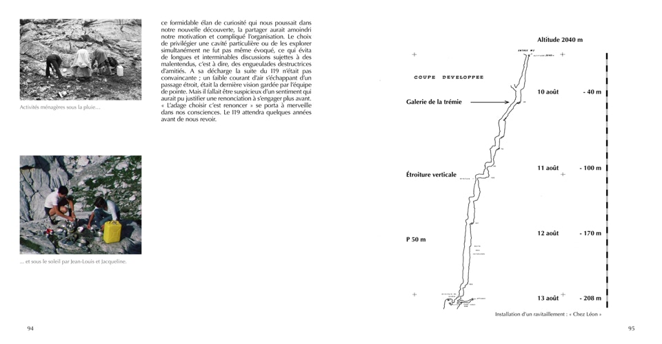 … Nous inventions, par nos découvertes et notre détermination, de nouveaux territoires et, par les profondeurs atteintes, redéfinissions le statut de ces sommets inversés. Tout aurait pu nous opposer mais seule une farouche volonté collective à surpasser les obstacles nous rapprochait. Étions-nous à la conquête d’un Mont Blanc, d’un Cervin, d’un Everest ou tout simplement d’une jolie colline couverte d’herbes folles ? ...