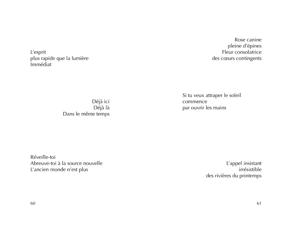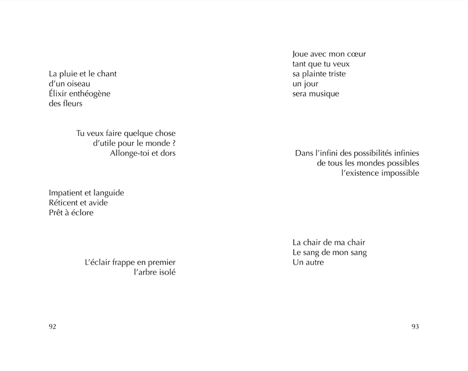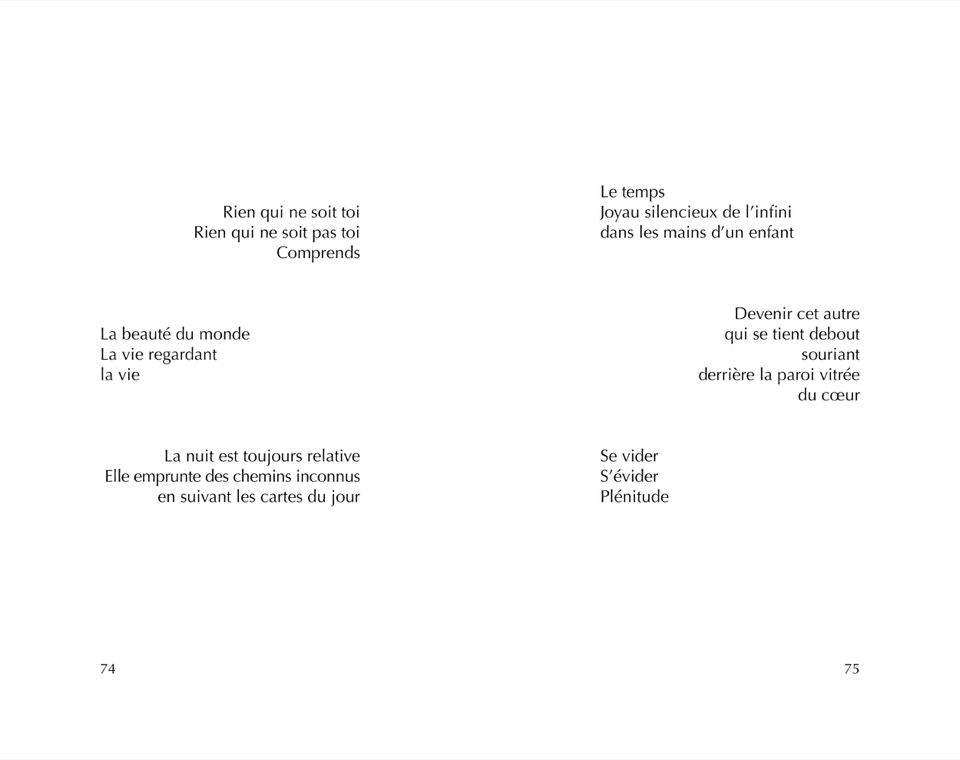 Ces poèmes, accessibles par trois sur chaque page, alternés entre gauche et droite, espoirs et passages à vide, observations et réflexions, forment un appel au chant et aux sourires, à déguster et faire vibrer comme on remue une gorgée de café avec sa langue, le temps qu'elle tiédisse.